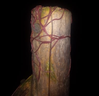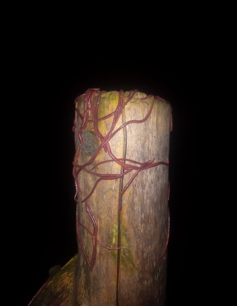 Earthworms climb a cedar fencepost during a rare rainstorm.