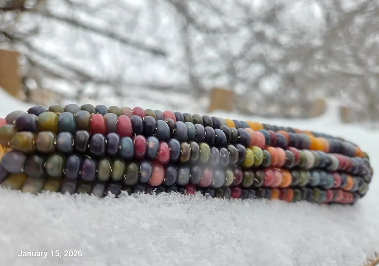 A good Winter task has been stripping the kernels from these lovely Glass Gem Popcorn cobs, saving them for seed and eating. Photo credit to Murph.